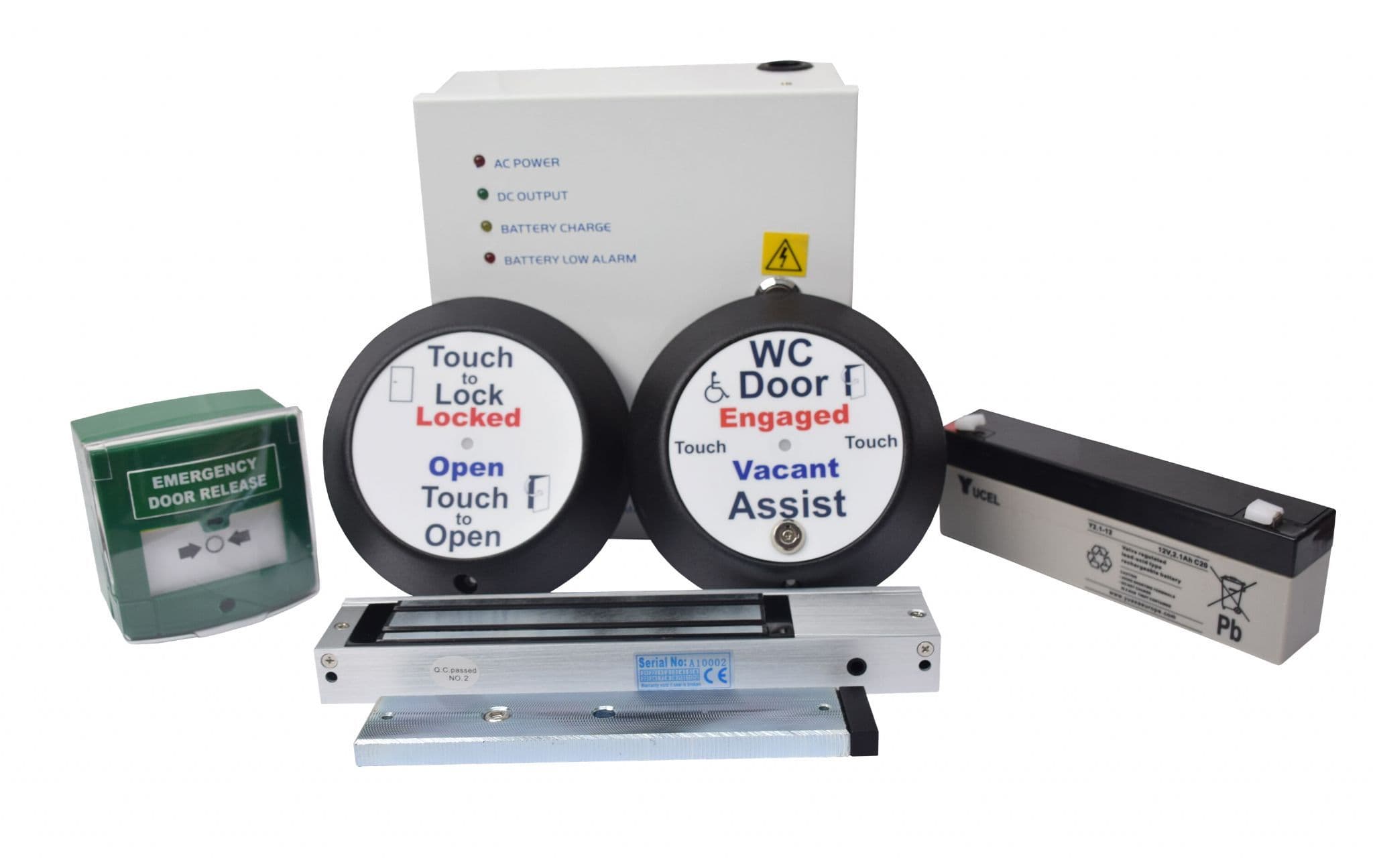 The hygienic disabled toilet locking system includes sensors, control PCB, power supply, battery, lock, and a break glass. It is an ideal solution for accessible toilet doors in offices, public restrooms, hospitals, doctors' surgeries, and shopping centres, designed to meet DDA compliance.Renowned for their simplicity, reliability, and adaptability, these systems are well-suited for individuals with limited dexterity, as no physical press is required. The system can be easily integrated into manual doors, existing automatic door openers, or supplied with a new operator.The touchless sensors are protected by SteriTouch®, ensuring that 99.9% of germs do not grow on them, promoting hygiene and ease of use.
